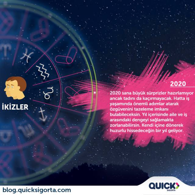 Sevgili İkizler; 2020 sana çok büyük sürprizler hazırlamıyor ancak tadını da kaçırmayacak. Hatta iÅŸ yaÅŸamında önemli adımlar atarak özgüvenini tazeleme imkanı bulabileceksin. Aile ve iÅŸ yaÅŸamı arasındaki dengeyi saÄŸlamakta zorlanacağın zamanlar olabilir elbet ama senin içinde –henüz fark edememiÅŸ olsan bile- herkesi kıskandıracak bir yaÅŸam arzusu var. Kendi içine döneceÄŸin ve huzurlu hissetmenin keyfine varacağın bir yıl seni bekliyor. Mutlu seneler.