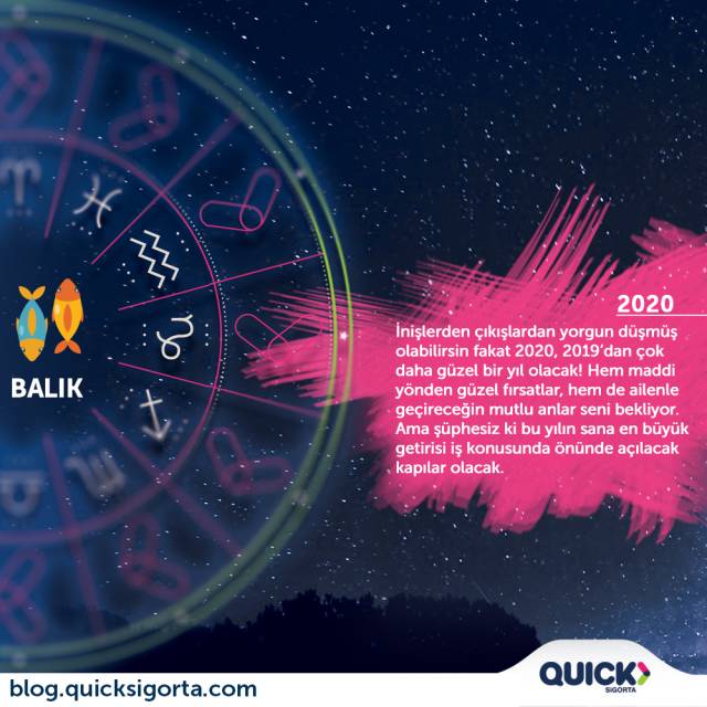 Sevgili Balık; hayatındaki iniÅŸli çıkışlı tablo seni yoruyor biliyorum ama sana güzel haber: 2020, 2019’dan çok daha güzel bir yıl olacak! Çok istediÄŸin deÄŸerli ÅŸeyleri satın alabilecek güce eriÅŸebilir, ailenle mutlu anlar yaÅŸayabilirsin. Ama ÅŸüphesiz ki bu yılın sana en büyük getirisi iÅŸ konusunda önünde açılacak kapılar olacak. Bu yıl beklemediÄŸin kadar büyük bir balık tutacaksın. Sonrasında da bereketlenen sofranda lezzetli günler geçireceksin. Zahmetsiz ve dertsiz, mutlulukla geçecek bir yıl dilerim.