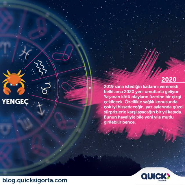 Sevgili Yengeç; 2019 ve öncesi sana istediÄŸin kadarını veremedi belki ama 2020 yepyeni umutlarla geliyor. YaÅŸanan kayıplar elbet telafi edilecek ve tüm kötü olayların üzerine bir çizgi çekilecek. SaÄŸlık problemlerinden arınarak ÅŸifa bulacak hatta turp gibi olacaksın. Özellikle yaz geldiÄŸinde fıkır fıkır hissedeceÄŸin günler olacak. Al iÅŸte, bunun hayaliyle bile yeni yıla mutlu girilebilir bence. ☺ Gönlünden geçen güzellikler hak ettiÄŸin üzere seni bulacak merak etme. Musmutlu yıllar.