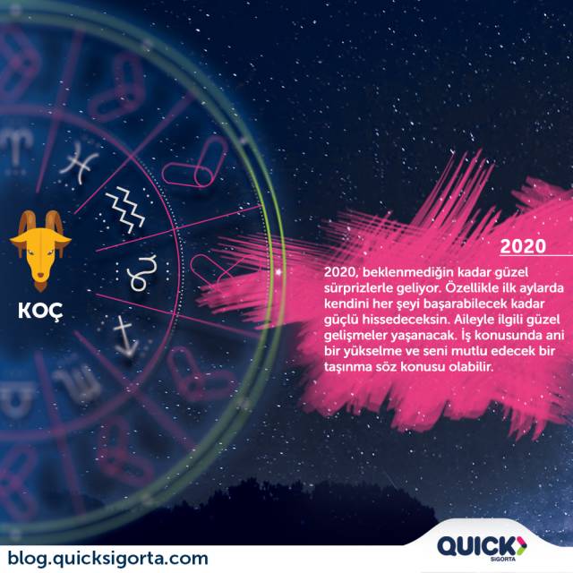 Sevgili Koç; 2020 sana hiç beklenmediÄŸin kadar güzel enerjilerle gelecek. Özellikle senenin ilk birkaç ayı kendini her ÅŸeyi baÅŸarabilecek kadar güçlü hissedeceksin ki sana da bu yakışır zaten.♥ Bu yıl ailenle ilgili geliÅŸmeler gündemini meÅŸgul edecek ancak merak etme kavga gürültü deÄŸil, güzel ÅŸeyler.☺ Hep hayallerini kurduÄŸun bir iÅŸ varsa bunun için gerekli adımları atabilir, ani yükseliÅŸ ve baÅŸarılarınla senden beklentisi olmayan kiÅŸileri de ÅŸoka uÄŸratabilirsin. Kendini çok daha mutlu hissedeceÄŸin bir yere taşınman da söz konusu olabilir. Güzel günler için ÅŸimdiden hazırla kendini, mutlu seneler.