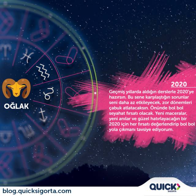 Sevgili OÄŸlak; geçmiÅŸ yıllarda almış olduÄŸun dersler seni 2020’ye bomba gibi hazırladı aslında ama farkında deÄŸilsin henüz. Üzücü olaylarla baÅŸ etme yöntemlerinden tut da kendin için doÄŸru olanı seçmeye kadar bir dizi konuda kendini geliÅŸtirdin, yetiÅŸtirdin. Artık hatalardan piÅŸmanlık duyacak, yapamadıkları için hayıflanıp duracak bir OÄŸlak yok! 2020 yılında hayallerine adım adım ilerleyen, gözü pek bir insan olacaksın. Çok da fazla seyahat edeceksin bu arada. Bak bunu unutma, seyahat ettiÄŸin yerlerden magnet almayı da tabi! ☺ Gezmeli tozmalı, macera dolu seneler!