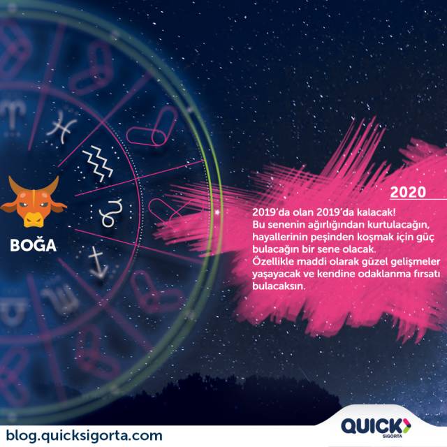 Sevgili BoÄŸa; 2019’da olan 2019’da kalacak, lütfen artık ÅŸu üzerindeki ağırlıktan kurtul ve ileriye bak. 2020 için kendine koyacağın hedefleri gerçekleÅŸtirebilecek gücü bulacaksın. Bu sene senin için tatsız geçti belki ama yepyeni bir baÅŸlangıç yapıyorsun artık. Bu yıl özellikle maddi olarak bereketli bir sene geçireceksin. Seni deÄŸersiz hissettiren insanlar dahil olumsuz her ÅŸeyi geride bırakacak ve yalnızca kendine odaklanacaksın. Maddi anlamdaki kısmetini umuyorum yılbaşı gecesi piyango biletinde görebilirsin, en kötü amorti olsun. ☺ İyi seneler.