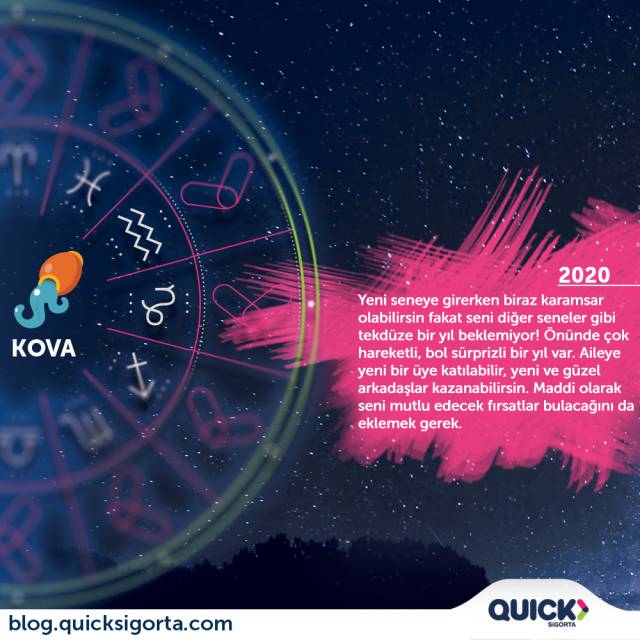 Sevgili Kova; 2019 ama iyi ama kötü dokunuÅŸlarıyla geldi ve geçti. Herkes gibi senin de yeni yıl için umutların olması gerekirken karamsar olman çok saçma! Çünkü seni diÄŸer seneler gibi tekdüze bir yıl beklemiyor! Daha hareketli, sürprizli hatta baya baya sürprizli bir sene geçereceksin sen. Aileye yeni bir üye katılabilir, güzel arkadaÅŸlıklar kurulabilir veya uzun zamandır beklenen bir gelir elde edilebilir. Sonrası da iyilik, saÄŸlık zaten. Huzurlu ve mutlu yıllar dilerim.