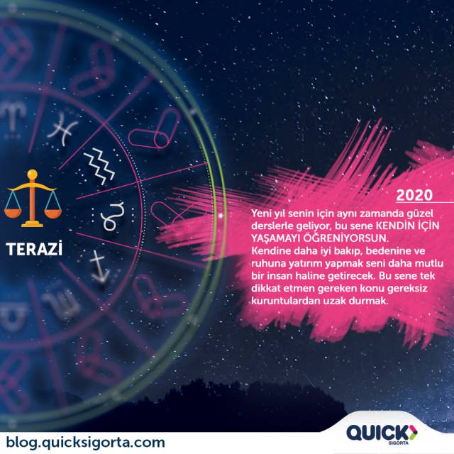 Sevgili Terazi; 2020 yılından alacağın var çünkü geçmiÅŸ yıllarda iliÄŸini kuruttu ÅŸu dert tasa. Sevdik sevmedik, tanıdık tanımadık dünyanın yükünü almışsın omzuna da sallanıyorsun. Ama böyle gitmez, bu yıl ÅŸöyle bir sarsılacak ve kendine geleceksin. Güzel haber; KENDİN İÇİN YAÅžAMAYI ÖÄžRENECEKSİN. Kendine daha iyi bakıp, bedenine ve ruhuna yatırım yapmak seni daha mutlu bir insan haline getirecek. 2020 sana bunun için gerekli imkanları fazlasıyla sunacaktır. Åžimdiden planlar yap ve gelecek güzel senenin tadını çıkarabileceÄŸin iÅŸler peÅŸinde koÅŸ. Mutlu yılların olsun.