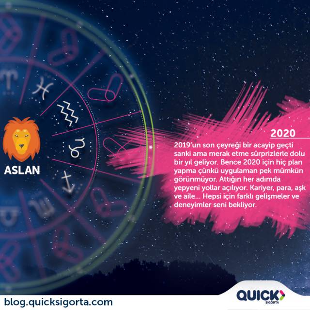 Sevgili Aslan; 2019 son çeyreÄŸi bir acayip geçti sanki ama 2020 sürprizlerle dolu bir yıl olacak senin için. Bence sen hiç plan yapma çünkü uygulaman pek mümkün görünmüyor. Attığın her adımda yepyeni yollar açılacak önünde. Kariyer, para, aÅŸk ve aile… Hepsi için farklı geliÅŸmeler ve deneyimler yaÅŸayacaksın. Özellikle de sevdiklerinle bir arada olacak ve onların mutluluklarına ortak olacaksın. Hayatta bundan daha güzel ne olabilir ki zaten? Sevdiklerinle kahkahalar içinde geçireceÄŸin bir yıl olsun.