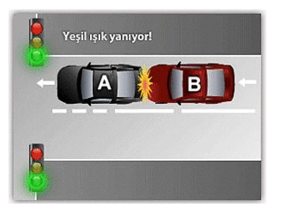 Bu krokide A aracı yeÅŸil ışıkta durduÄŸu için B aracı da hız sınırını koruyamadığı için kusurlu. Hasar tespitinde Karayolları Trafik Kanunu 57 ve 52. maddesine göre her iki araç için yüzde 50 kusurlu diyebiliriz. Kağıt üzerinde böyle görünse de bu noktada tutanaklar önemli. ÖrneÄŸin A aracı sürücüsü "önümden kedi geçiyordu" durdum diyorsa ki genelde geçerli bir nedenle durmuÅŸ oluyor, o durumda arkadan çarpan B aracı kusurlu olmuÅŸ oluyor. Türkiye genelinde de pratikte istisnalar dışında her zaman arkadan çarpan araç kusurlu durumda olur.
